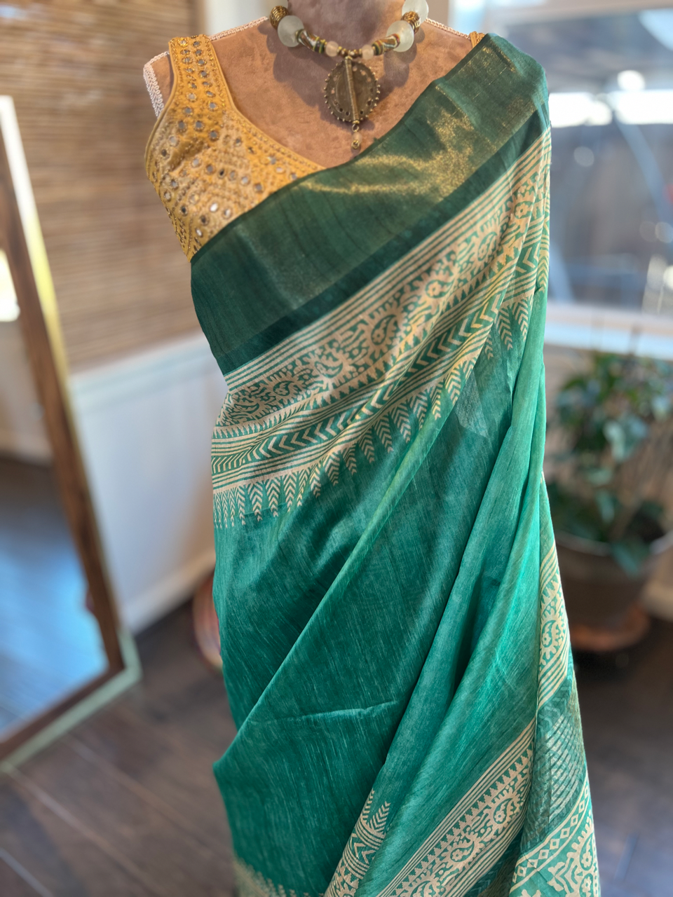 This saree features a rich, vibrant green color made from luxurious Tussar silk. Intricate golden woven border adorns the entire fabric, creating a harmonious blend of tradition and modernity. The detailed patterns on the print enhance its overall beauty. Ideal for festive occasions or formal events, this saree pairs well with statement jewelry.