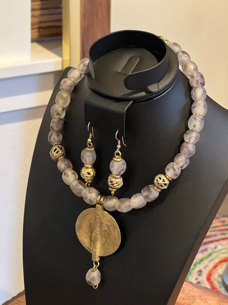 This necklace is a striking piece of handcrafted jewelry, embodying the vibrant spirit of African artisanship. It features a choker-style design, adorned with recycled glass beads in subtle shades of lavender, reflecting a commitment to sustainable practices. The focal point is a brass pendant, which showcases intricate patterns and craftsmanship, inspired by traditional African motifs.Â