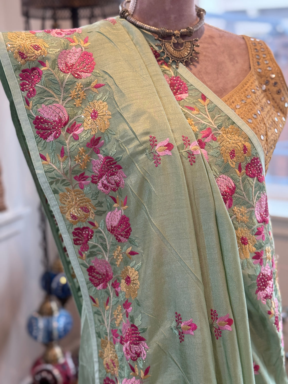 The saree features a soothing pastel green hue, reminiscent of fresh spring leaves.