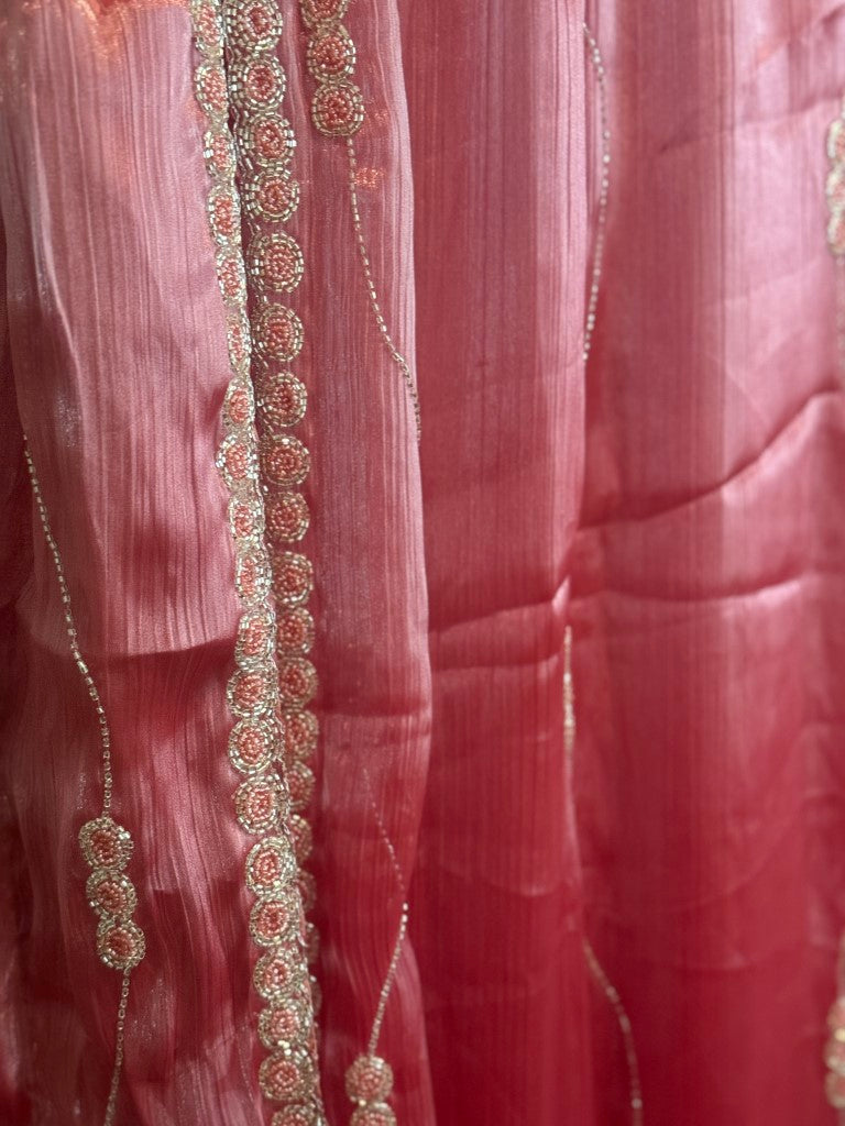 This is a luxurious pink party saree featuring intricate Jimmy Choo-inspired handwork. The embroidery consists of delicate silver and pink beadwork arranged in ornate floral and circular patterns along the borders, adding an elegant, festive touch. The lightweight, translucent fabric enhances its graceful and stylish appeal, making it perfect for glamorous occasions.