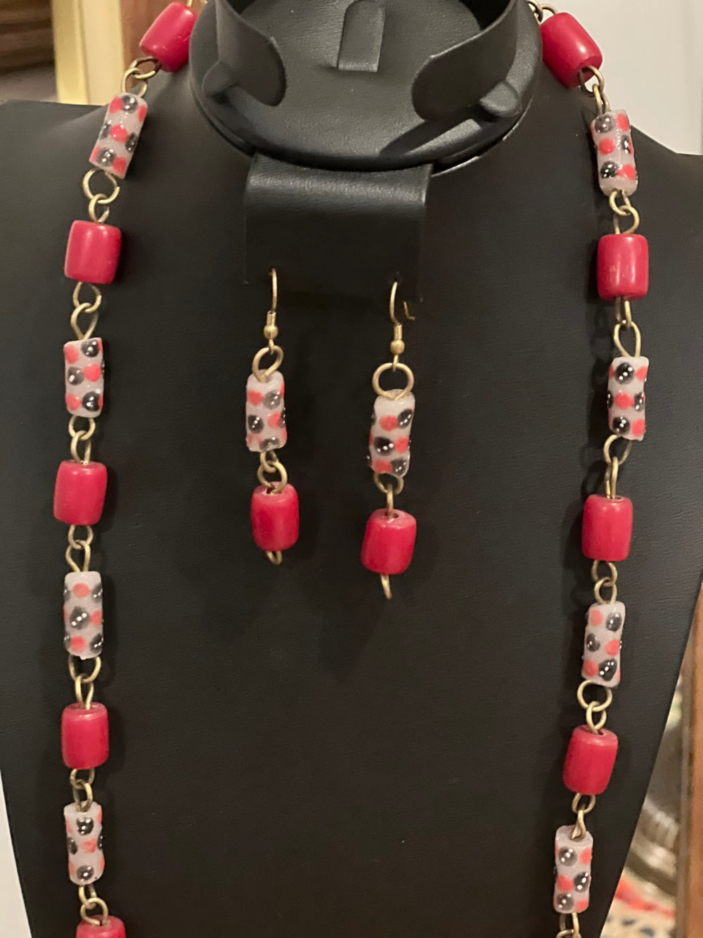 This necklace is a striking piece of handcrafted jewelry, embodying the vibrant spirit of African artisanship. It features a long-style design, adorned with bone beads in rich shades of red, reflecting a commitment to sustainable practices.