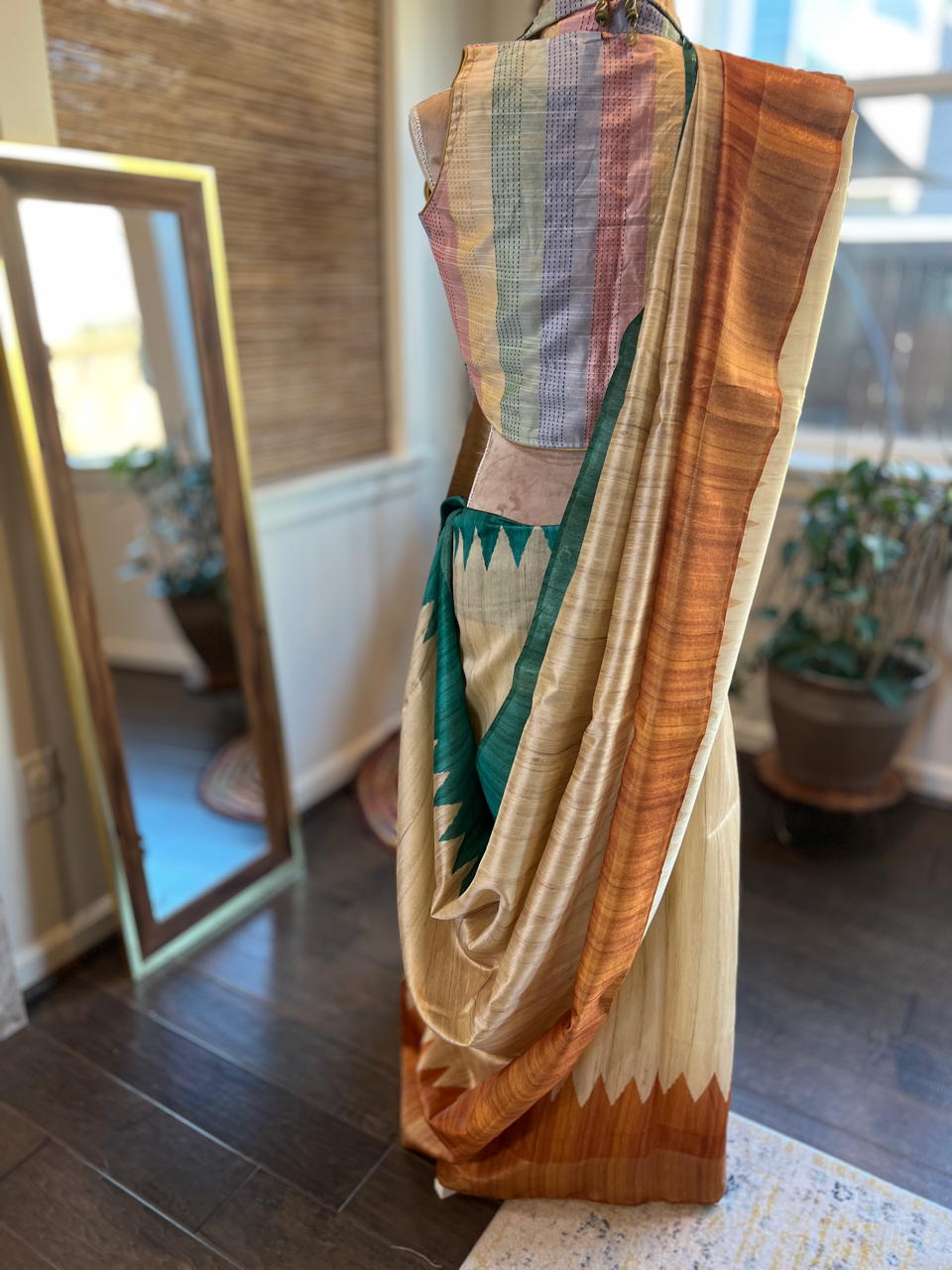 Off White Tussar silk saree woven in ganga jamuna style and matching tassels at the end of the pallu. The saree features a beautiful temple ikat style borders in brown and bluish green color on top and bottom along with rows of khadi stripes on the pallu. This is truly one of the most elegant pieces from our collection.