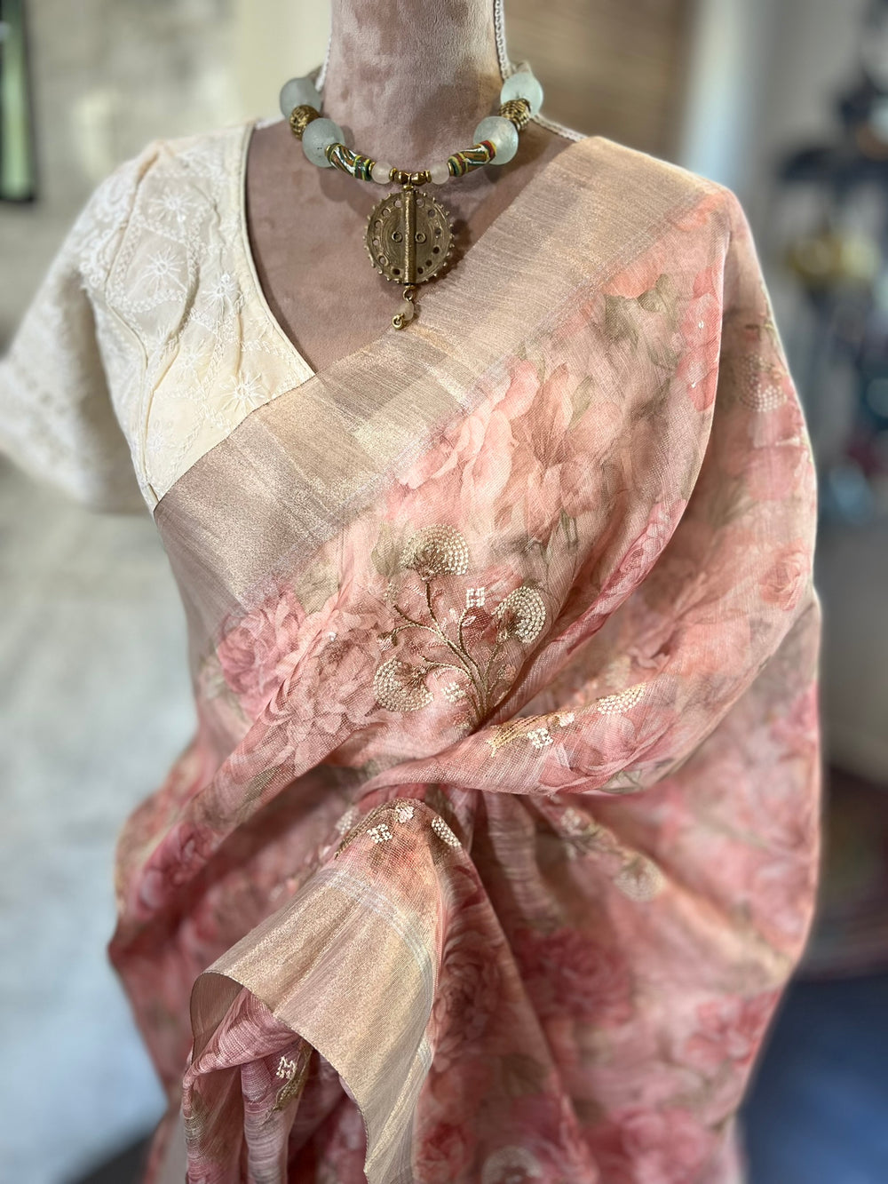 Onion Pink Floral Organza Tissue Saree