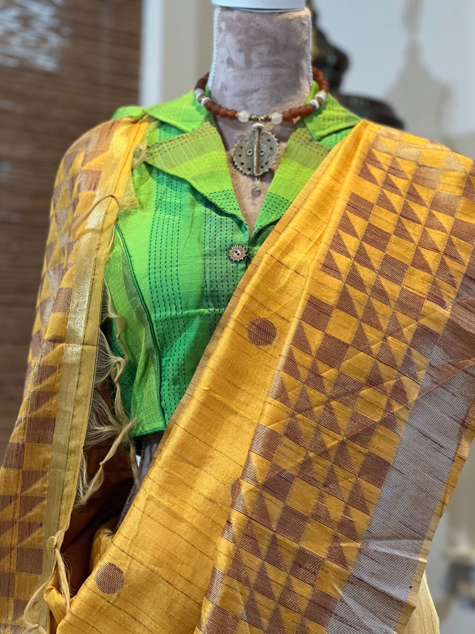 This saree features a vibrant yellow hue made from luxurious Tussar silk. The intricate bronze and beige round butis add elegance, while the tassels on the pallu provide a playful touch. Perfect for special occasions, weddings, or cultural events, this saree will make you feel radiant and elegant.