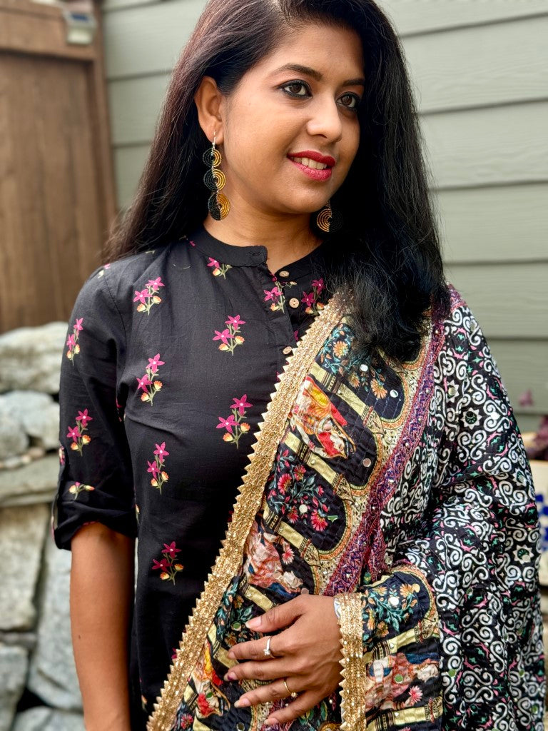 Embrace the elegance of South Asian heritage with this exquisite black Pakistani dupatta stole. Crafted with meticulous attention to detail, this stole boasts an array of vivid hues and traditional digital prints that come alive with shimmering mirror work. Each panel tells a story through its unique pattern, making it more than just an accessory—it’s a piece of art. Perfect for adding a touch of glamour to any outfit.