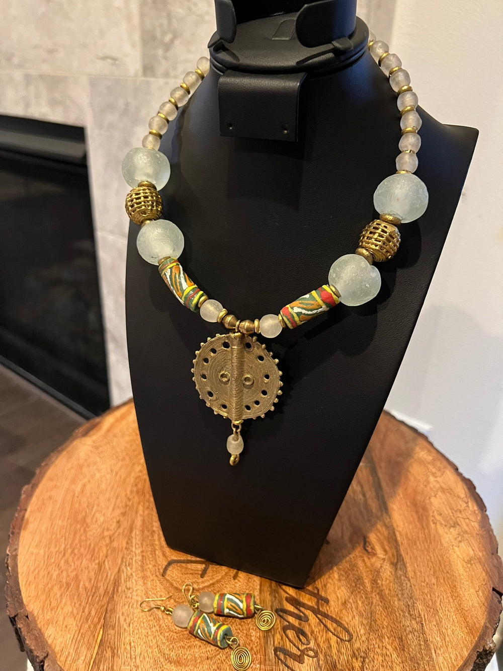This necklace is a striking piece of handcrafted jewelry, embodying the vibrant spirit of African artisanship. It features a choker-style design, adorned with recycled glass beads in shades of white, reflecting a commitment to sustainable practices. The focal point is a brass pendant, which showcases intricate patterns and craftsmanship, inspired by traditional African motifs.